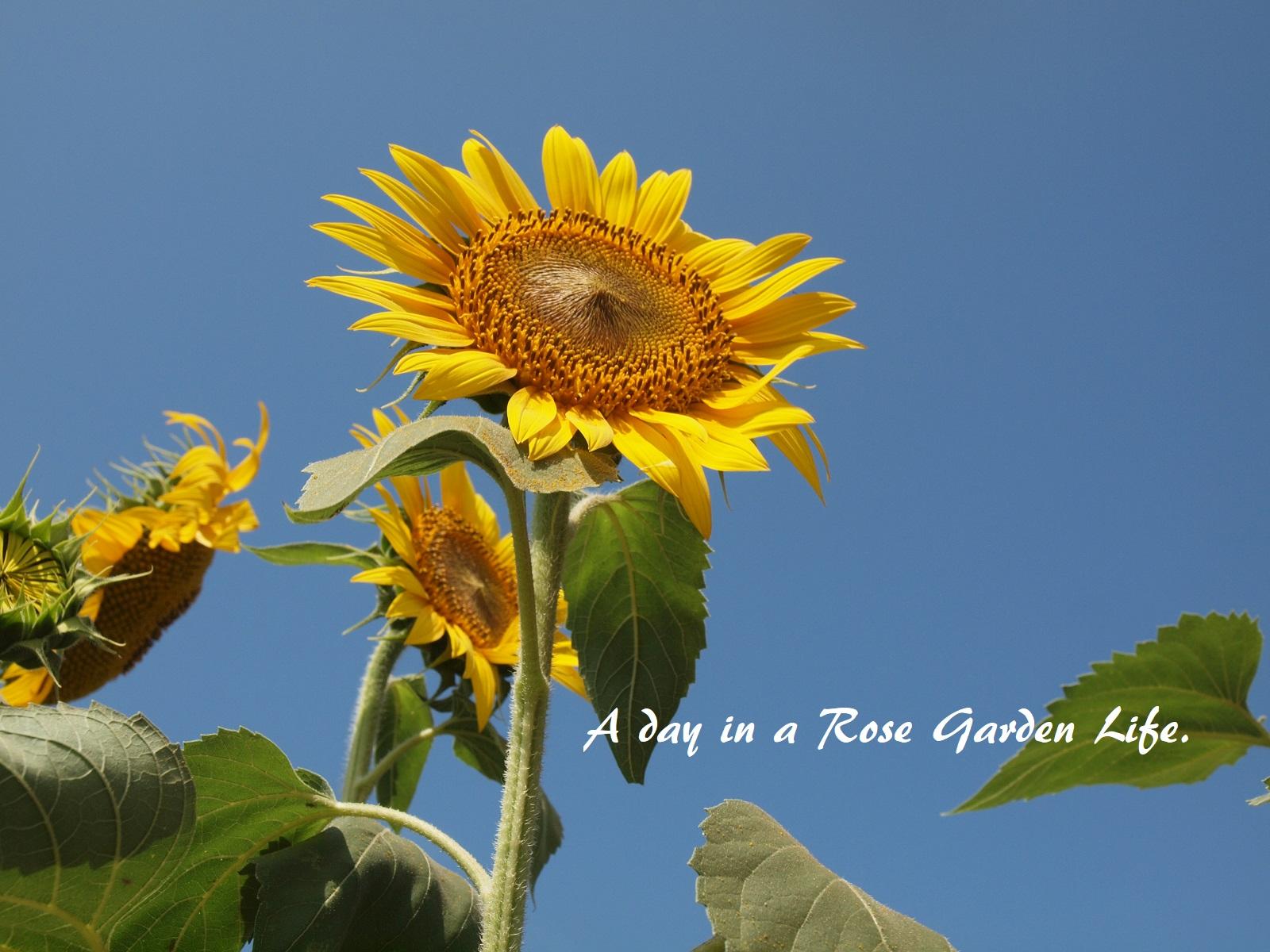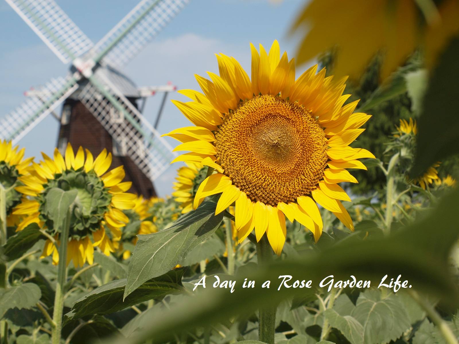 ひまわりは太陽の出てくる方向を向いて咲くので、東側を向くのですが、たまーに違う方向を向いて咲いてるものもあります。ひまわり畑の後ろにある風車を一緒に写そうと思うと、こういう違う向きの花を探してあげるときれいに取れます。