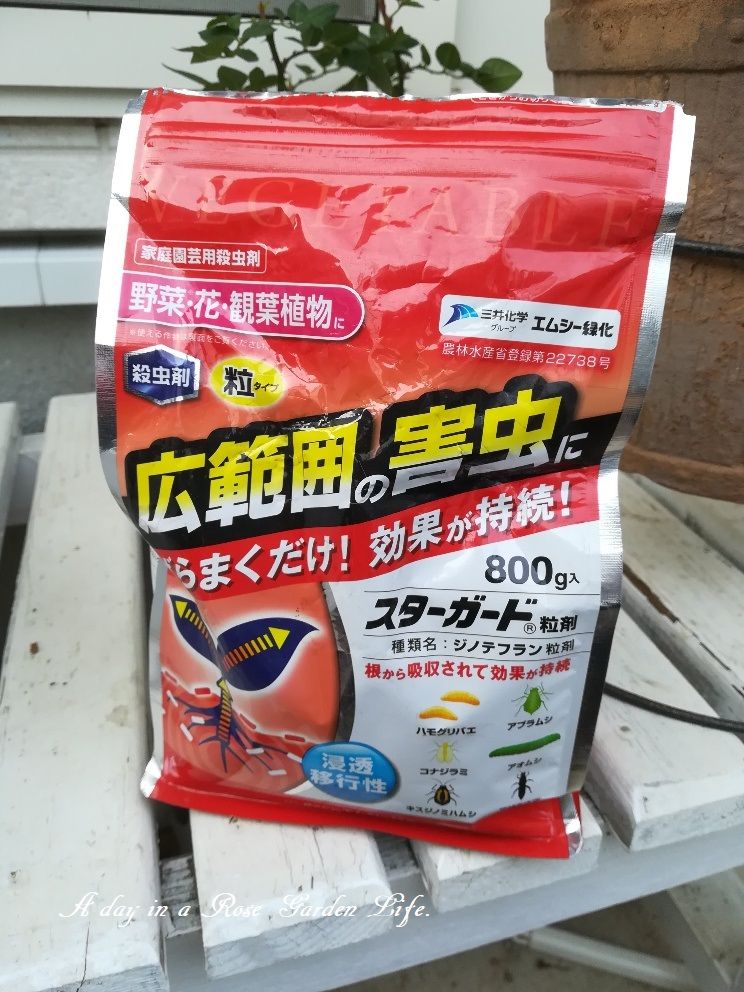 芳純の蕾がだいぶ色づいてきていますが、この時期に一番狙われやすいアブラムシの対策には、このような粉末の薬剤を株元に巻くことができるうのが重宝します。