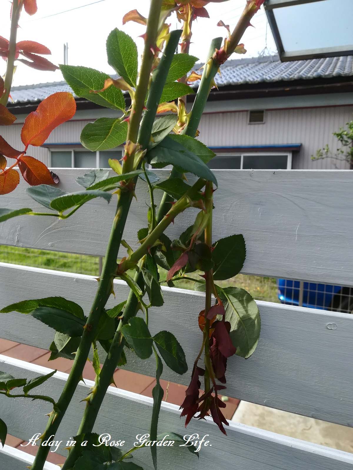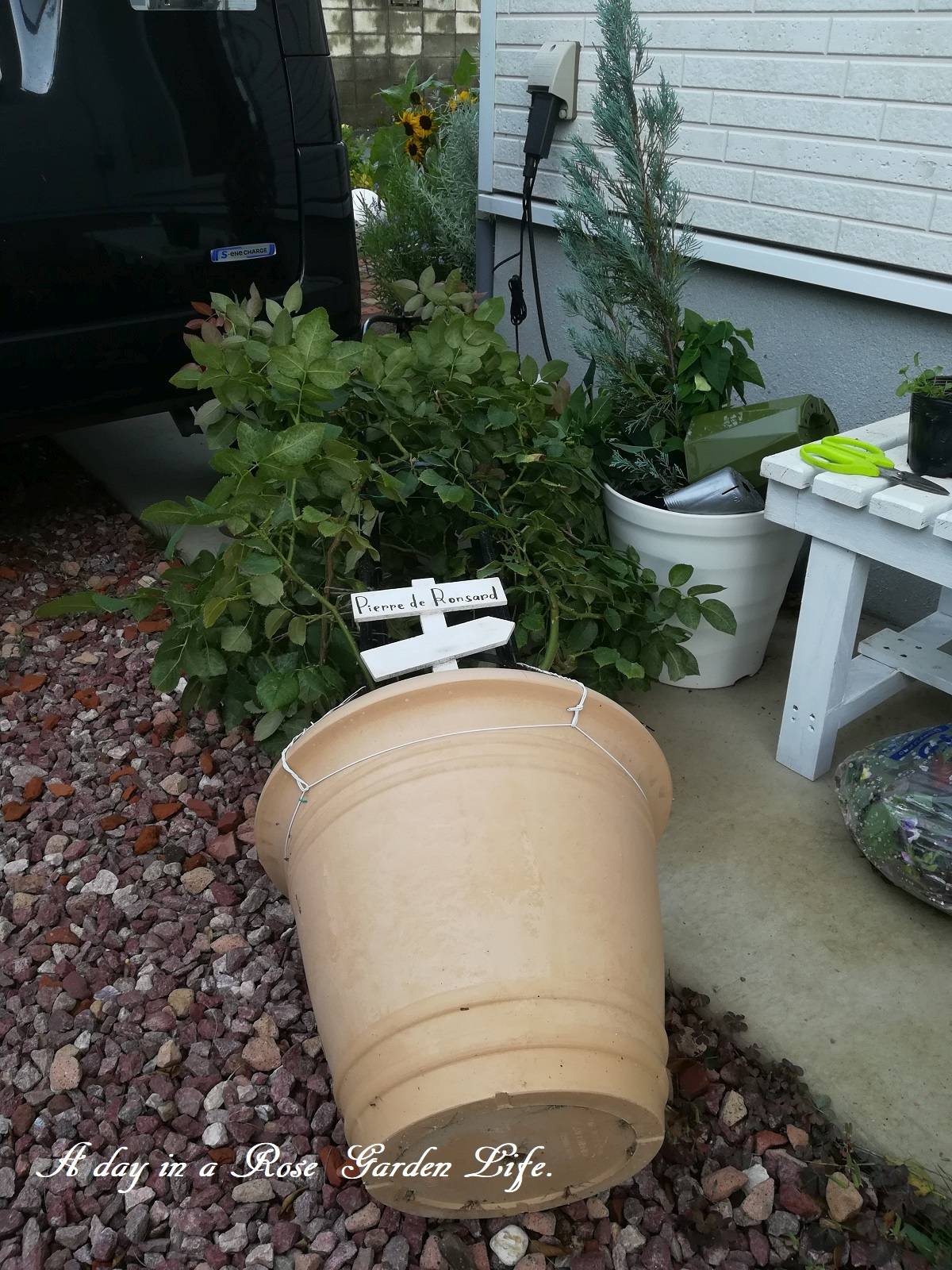事前にカーポートへ退避してたバラは大丈夫でしたが、それ以外はことごとく倒れている、、、