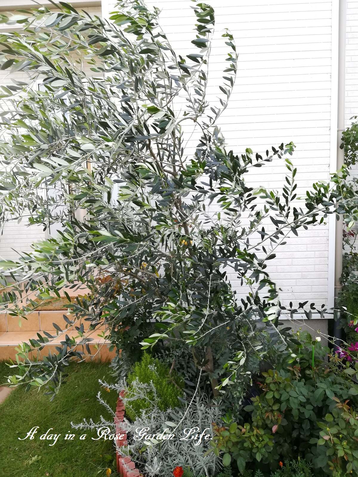 玄関のオリーブも、雨風でだいぶ傾いてしまうので、少し整枝しました。