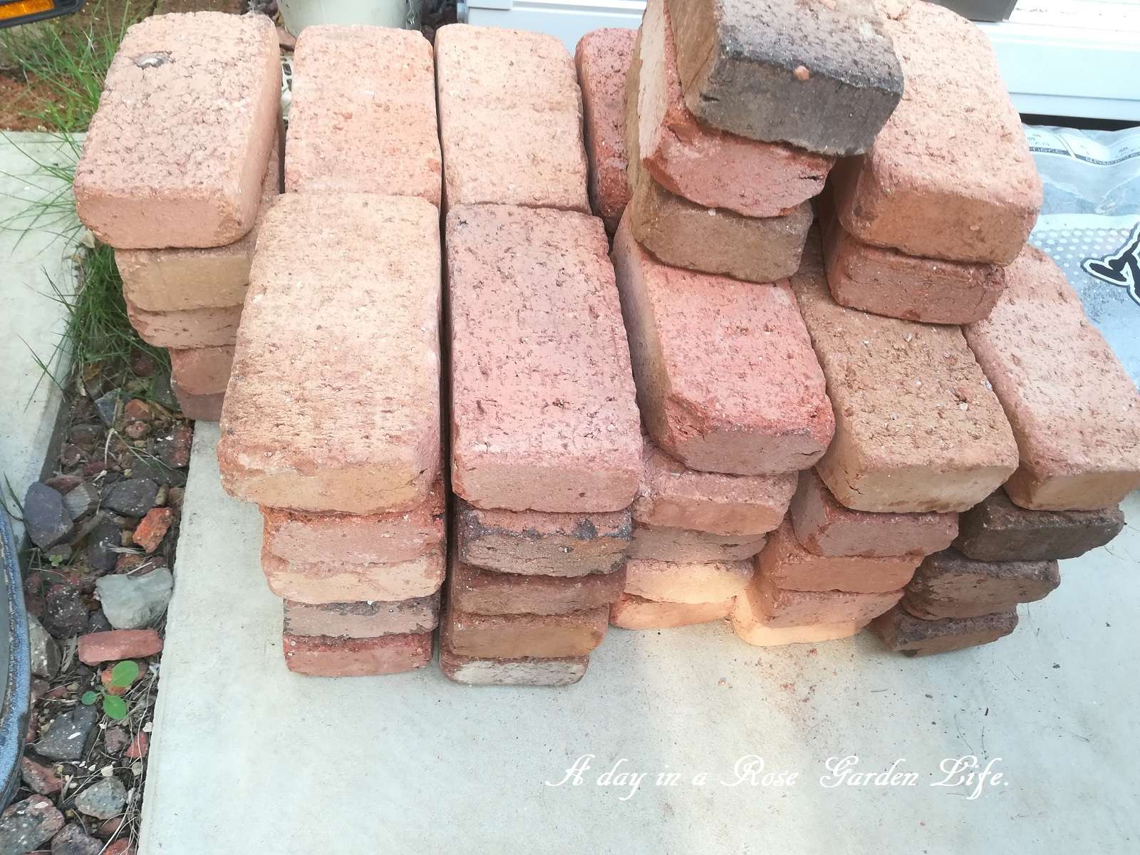 ガーデニングシーズンになると、近所のホームセンターではいつも使ってるレンガが安くなるので、ある程度まとめて買ってきます。今回は60個。一個あたり73円です。