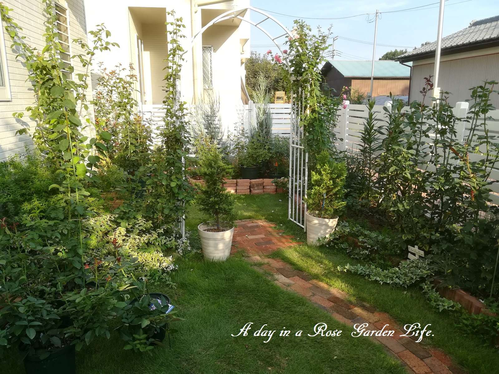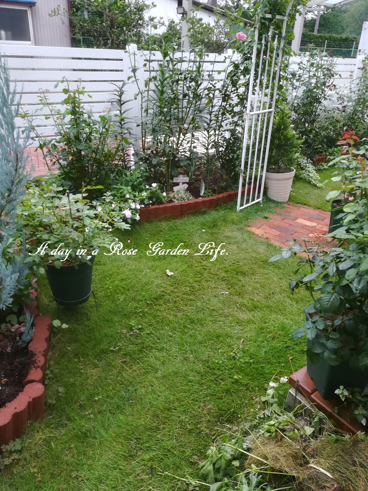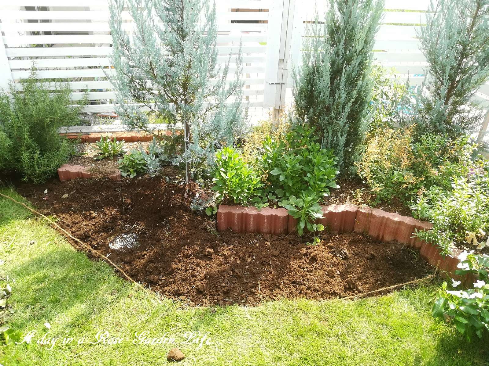 ここは我が家の庭でも南東側になるので、日当たりはこの写真での奥側フェンスよりなら良好ですが、コニファーを植えてあるのと、隣家の建物の配置の都合上、手前側は昼前にならないと直射日光が入ってこないスペースです。