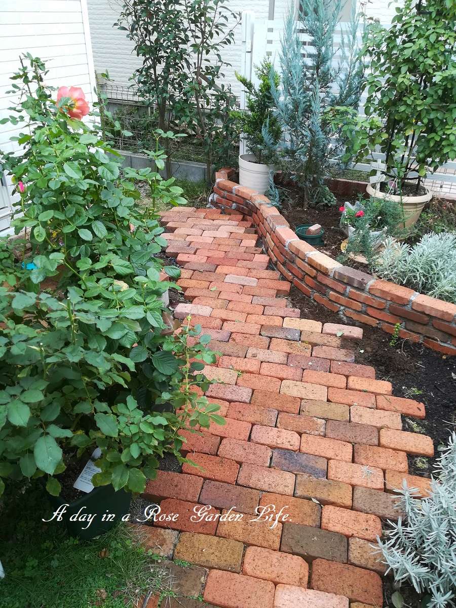 敷きレンガの作業も、長い間中断になっていましたが、今朝は午前中は何とかもったので、少しだけ作業しました。