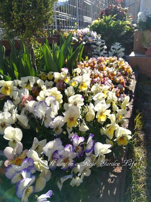 一番手前に見えているのは鉢で育てているシャンテ・ロゼ・ミサト。こちらはオベリスク仕立てにしました。