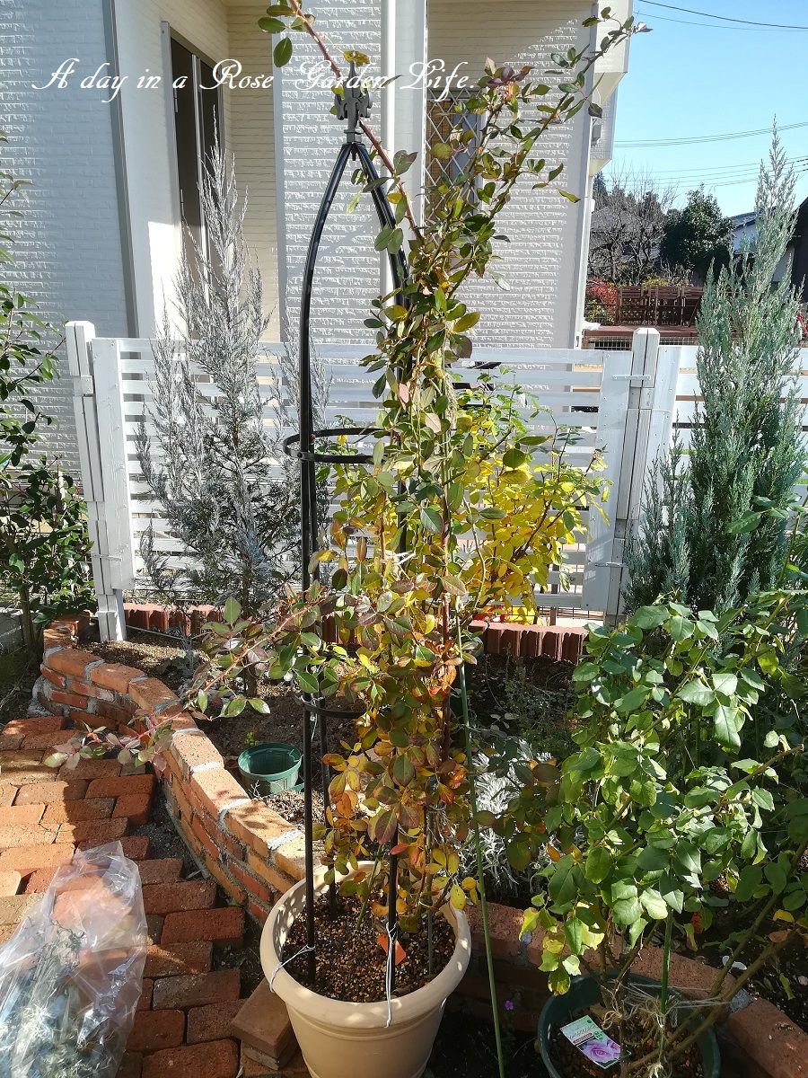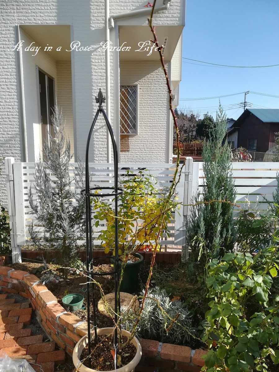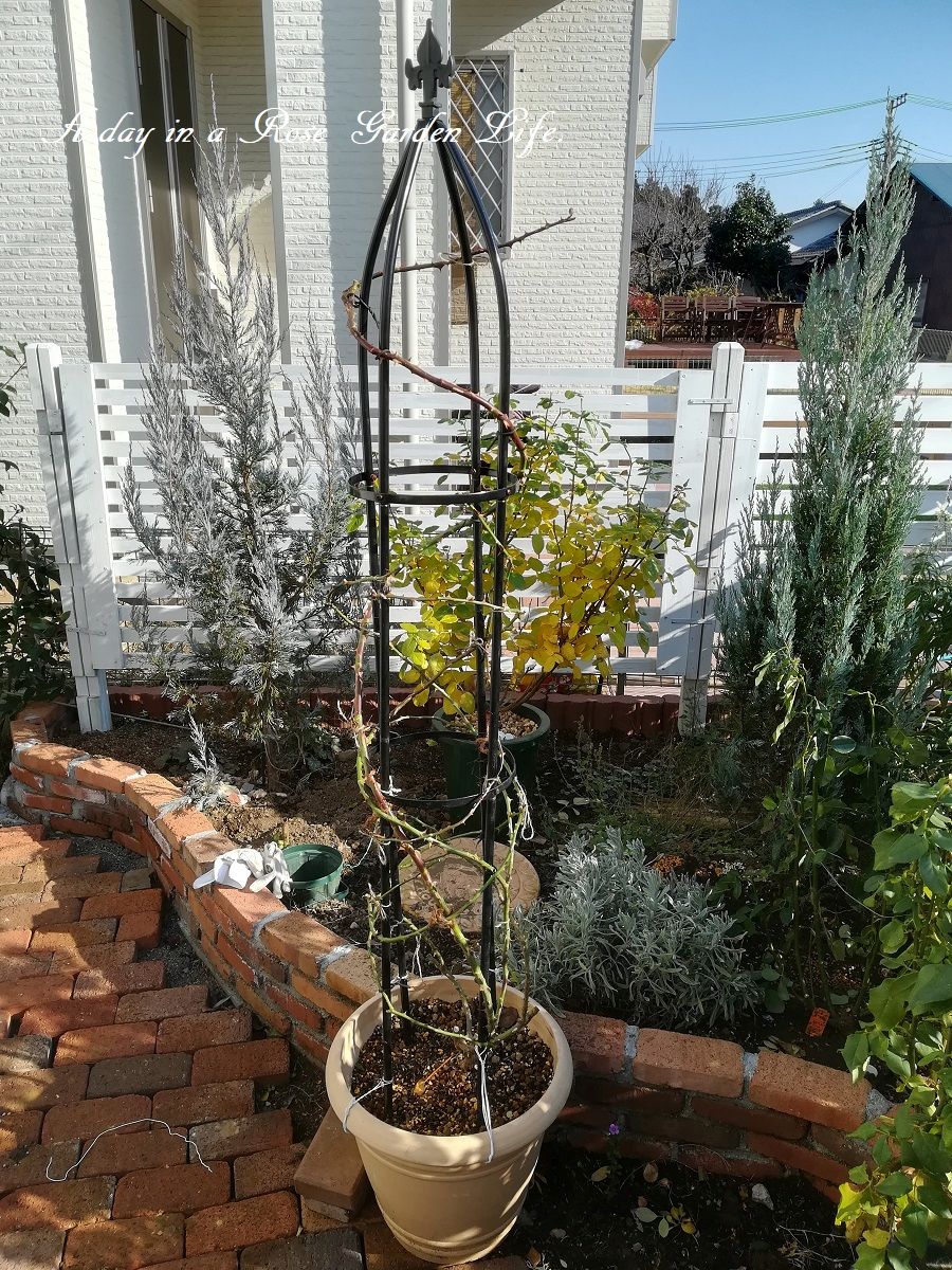 今年は今までピエール・ドゥ・ロンサールを巻いていたオベリスクを使って仕立てます。