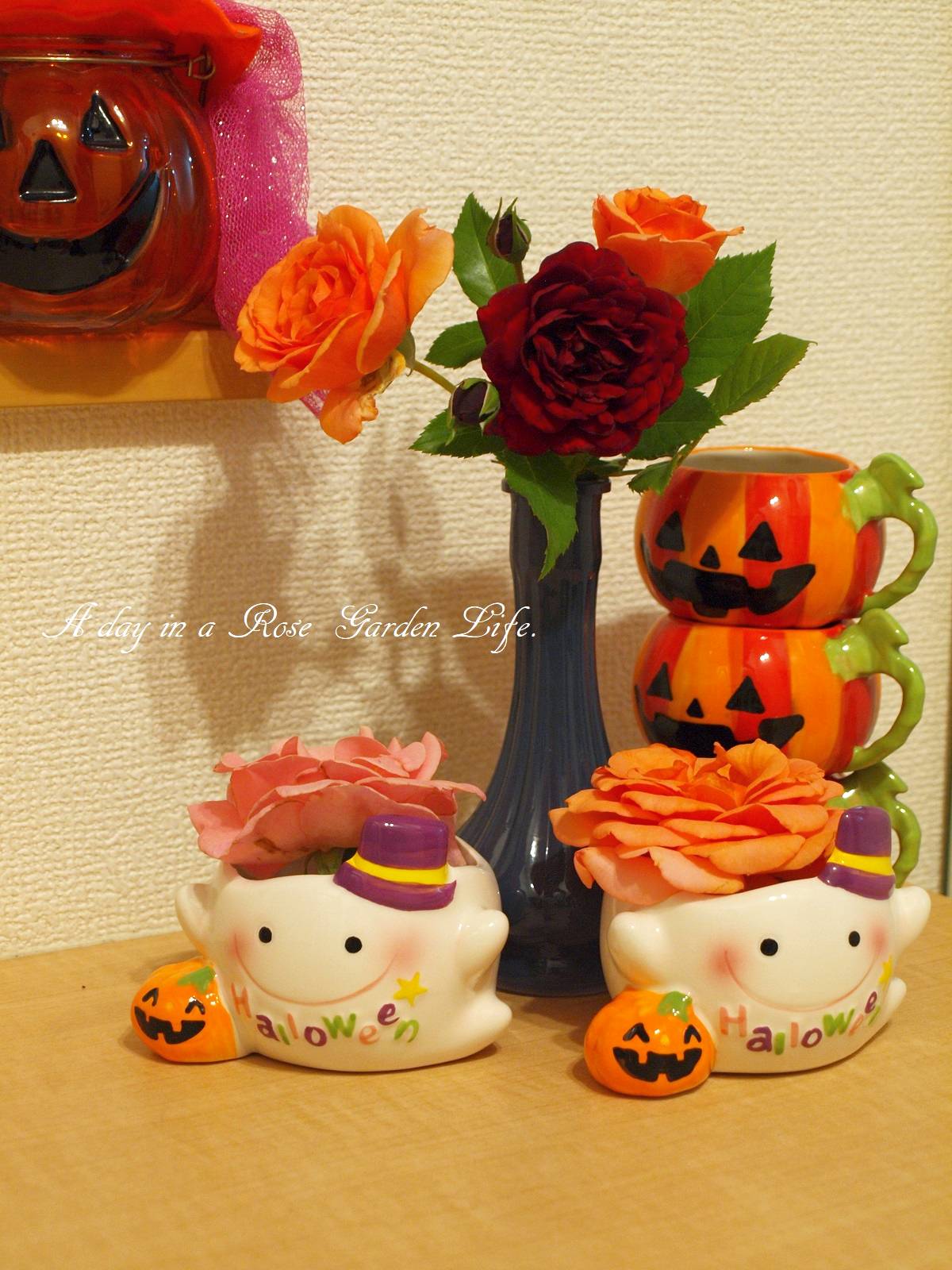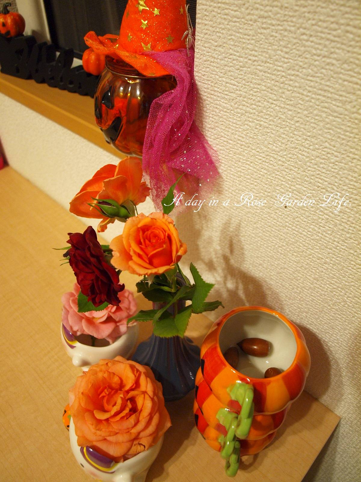 ハロウィン仕様 バラの成長記録 2017年10月05日 帰宅すると、妻の手により、玄関のハロウィン飾り付けにバラがコラボしてました。 バラは「杏奈」「黒蝶」「ギィ・ドゥ・モーパッサン」。 器に入っているどんぐりは、2年くらい前に、当時の職場の敷地に植わっている木のものを拾ってきたものです。マテバシイかな。 ↓最新刊でます 10月6日発行★Vol.8【本】 ガーデンダイアリーVol.8 -バラと私の物語- Garden Diary Vol.8★クロネコDM便にて送料無料 代引き決済不可 いつも多くの方々に見ていただき、ありがとうございます。 よろしかったらポチっとしていただけると、更新の励みになります☆ミ にほんブログ村 [0回]PR