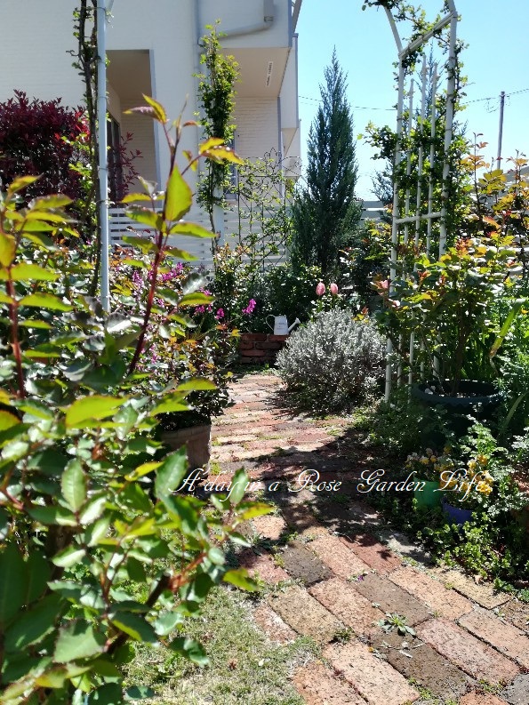 こちらは庭奥のアーチ。昨年アーチのバラを左右合わせるためにレオナルドダビンチへ