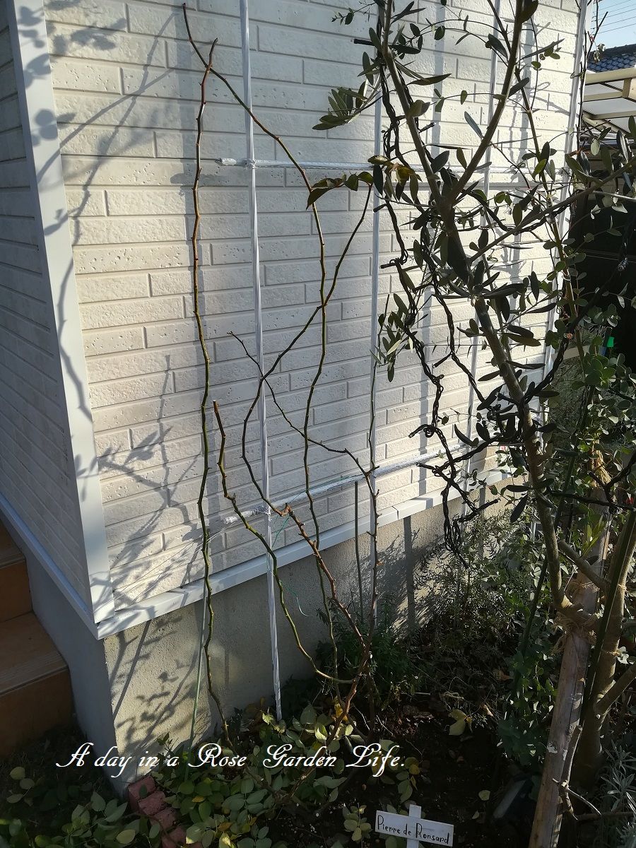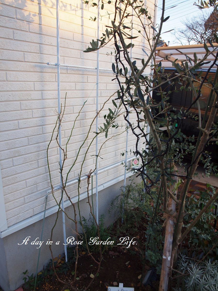 年末休みは実家帰省なのと、来週は土曜出勤があるので、急ピッチでつるバラの誘引を進めています。今日はエントランスの壁面誘引にしている