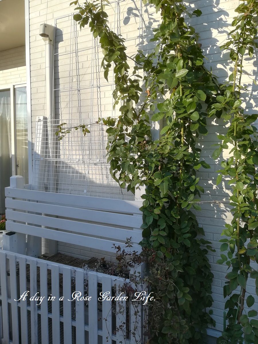 以前も紹介している自作のエアコンカバーに、このロンサールを誘引するスペースをネットでつけていたのですが、成長良すぎて全く収まる気がしないので、フェンスを上部に増設しました。