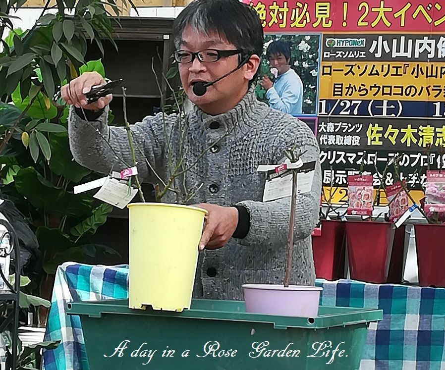 小山内先生曰く、剪定に必要なのは勇気。良い花を咲かせるためには芽の位置を見てしっかり切り戻す必要がある。このスタンダードローズだと、継ぎ口から上の部分について、1/3の位置を目安に切る。