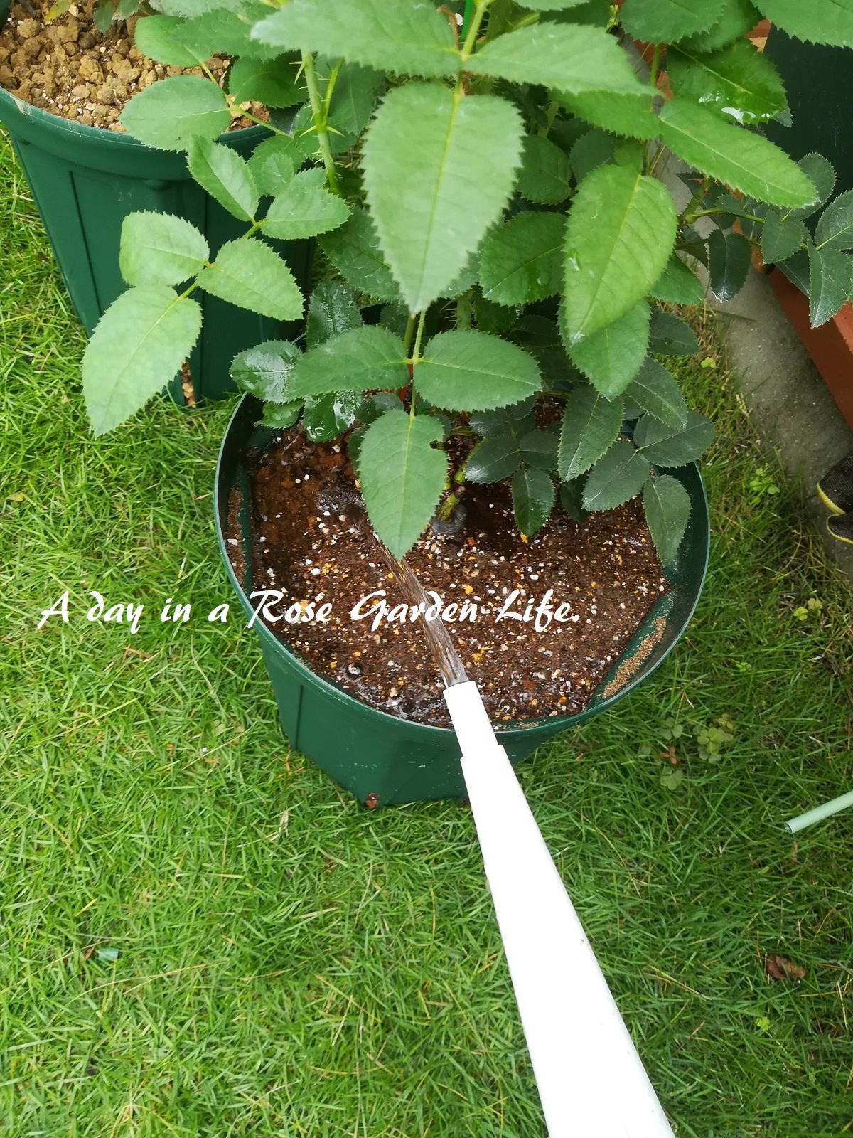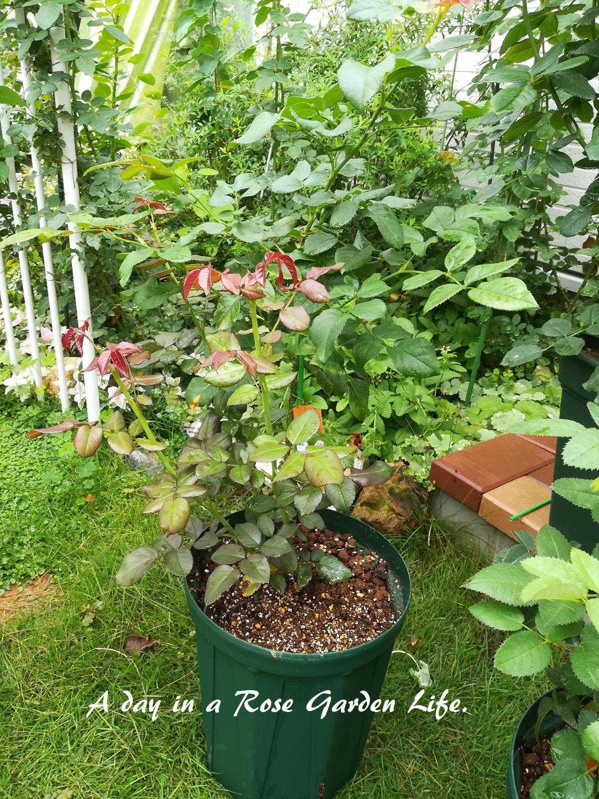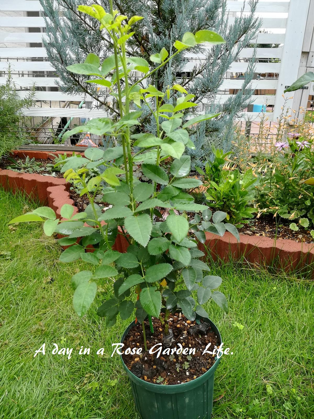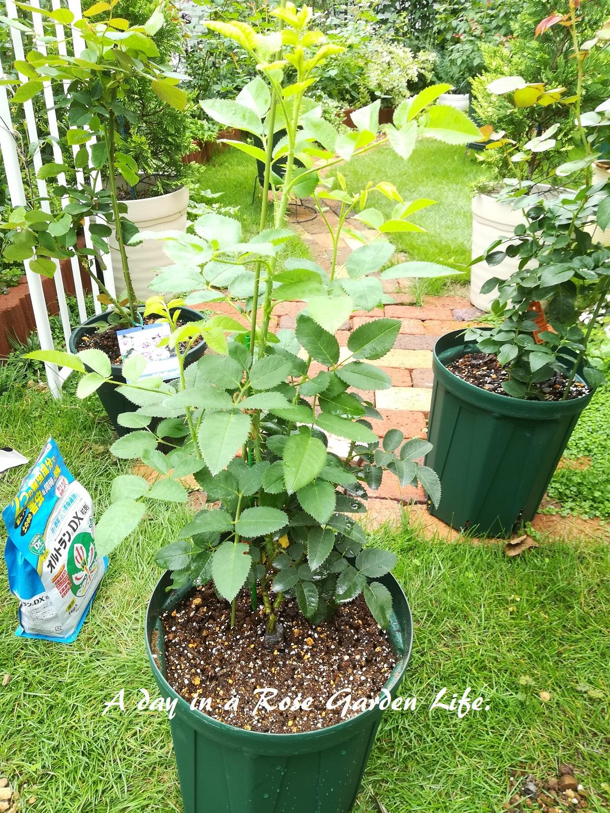 7/16に植えたハンス・ゲーネバインとフェリシテ・パルマンティエを、6号鉢から8号鉢へ鉢増ししました。