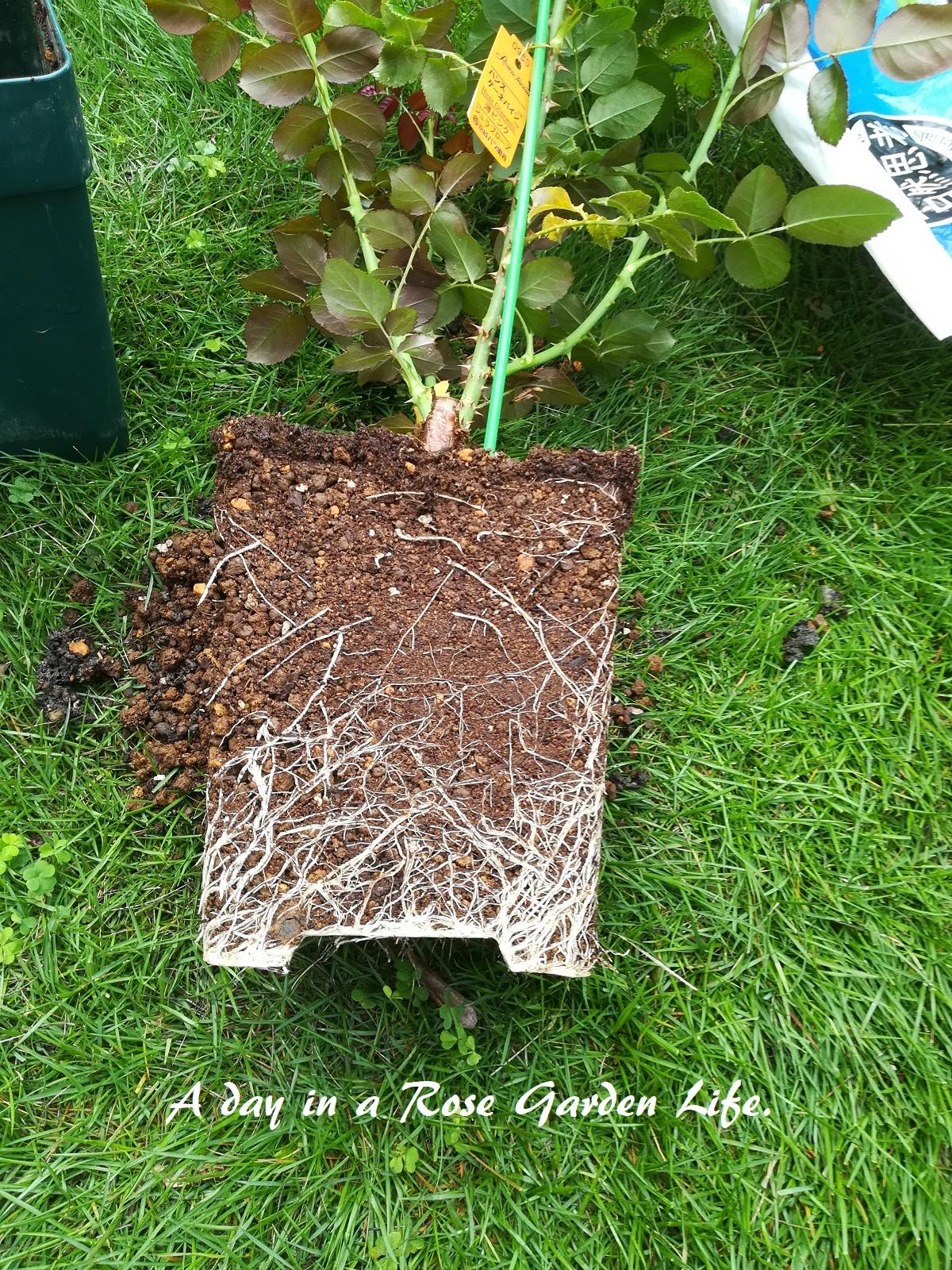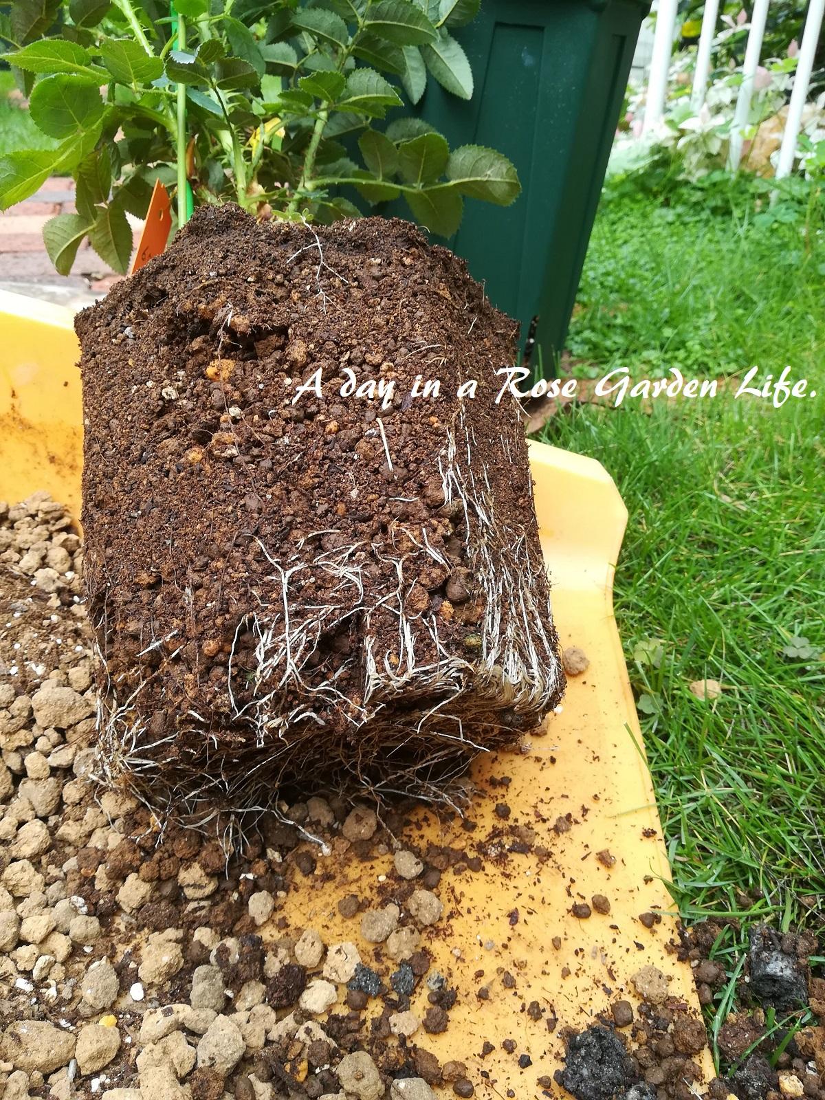 ハンスゲーネバインはバラの家6号鉢、フェリシテ・パルマンティエはロングじゃないスリット鉢へ植え付けてましたが、スリット鉢だとサークリングしないというのがよくわかります。