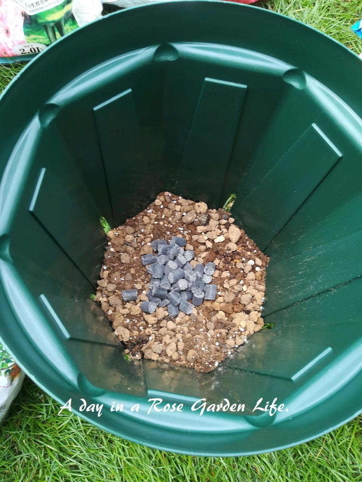 今回は日清ガーデンメイト の 醗酵油かすを元肥としてあらかじめ鉢底へ入れました。有機肥料を土をかけないで鉢植えに置くと、やっぱり虫が来ます。