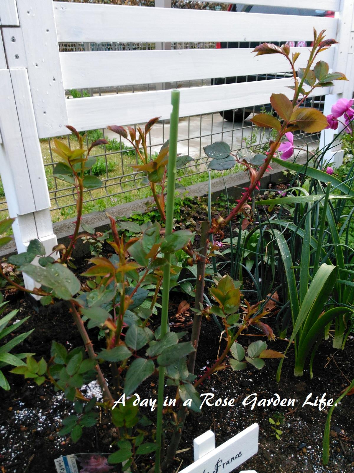 ジャルダン・ドゥ・フランスはFLローズなので浅めの剪定をするのが基本なんですが、前年にすごくシュートが良く出ていたので、ベーサルシュートは深めに剪定しました。