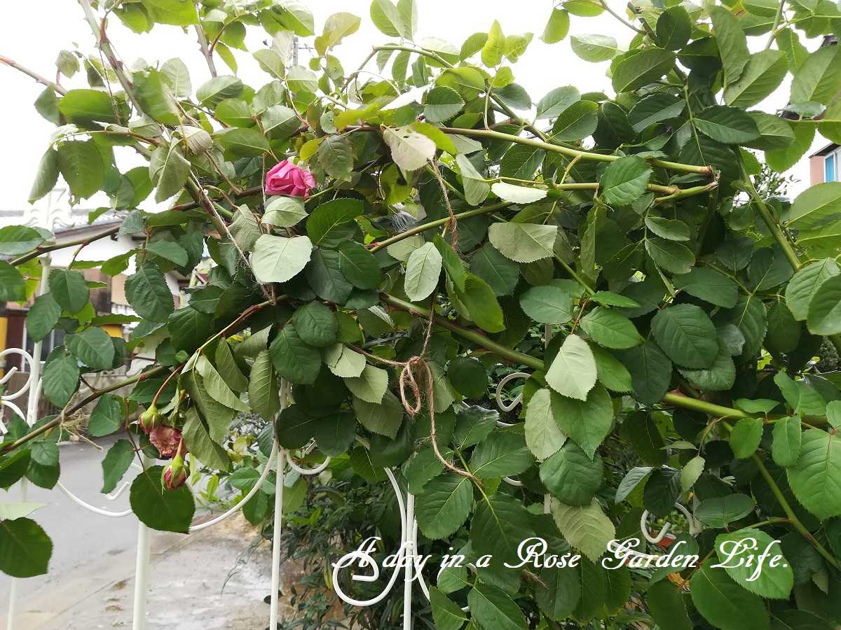 枝が太いHTは損傷が少なく、アーチそばに植えてあるヒストリーは華麗な花を咲かせています。