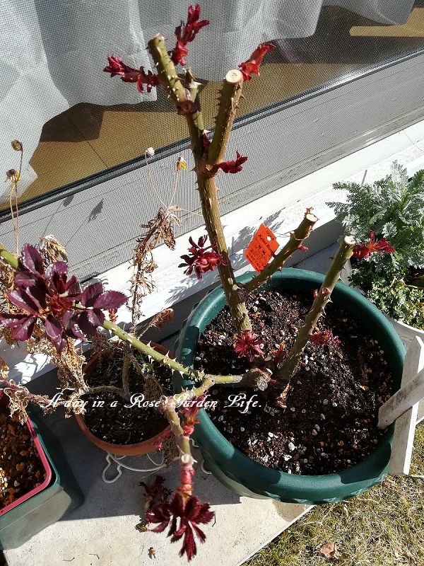 バラもさらに芽吹きが進んできました。まだ品種によってばらつきがあるんですが、この芳純やシェエラザードはかなり芽吹きが進んでいるので、芽かきを開始しました。今の段階では、明らかに無駄になる芽だけを摘んで、多めに残す形にしています。