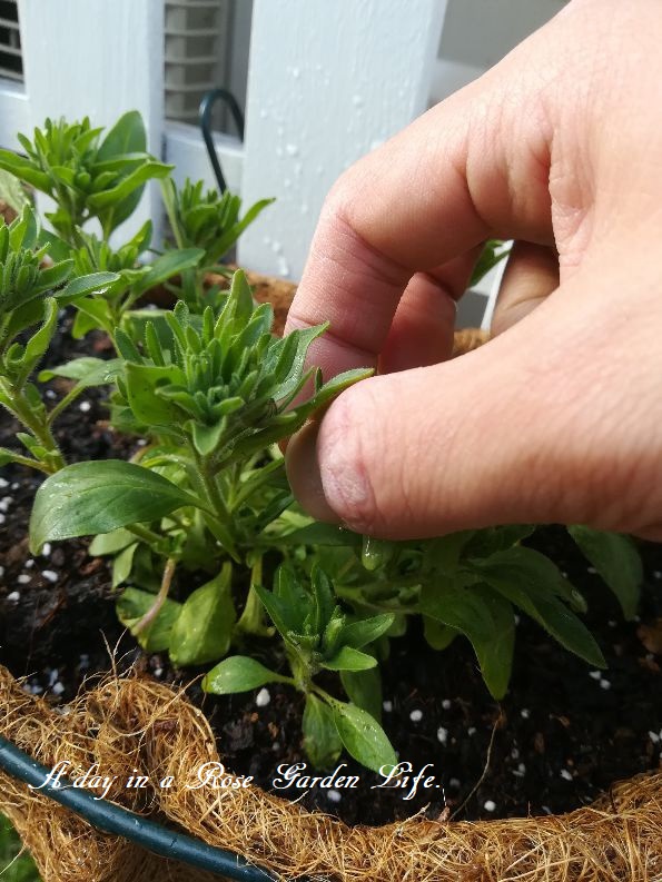ここで枝先をピンチします。サフィニアは結構枝が伸びるのですが、ピンチすると枝数が増えて丸く仕上がるはずです。