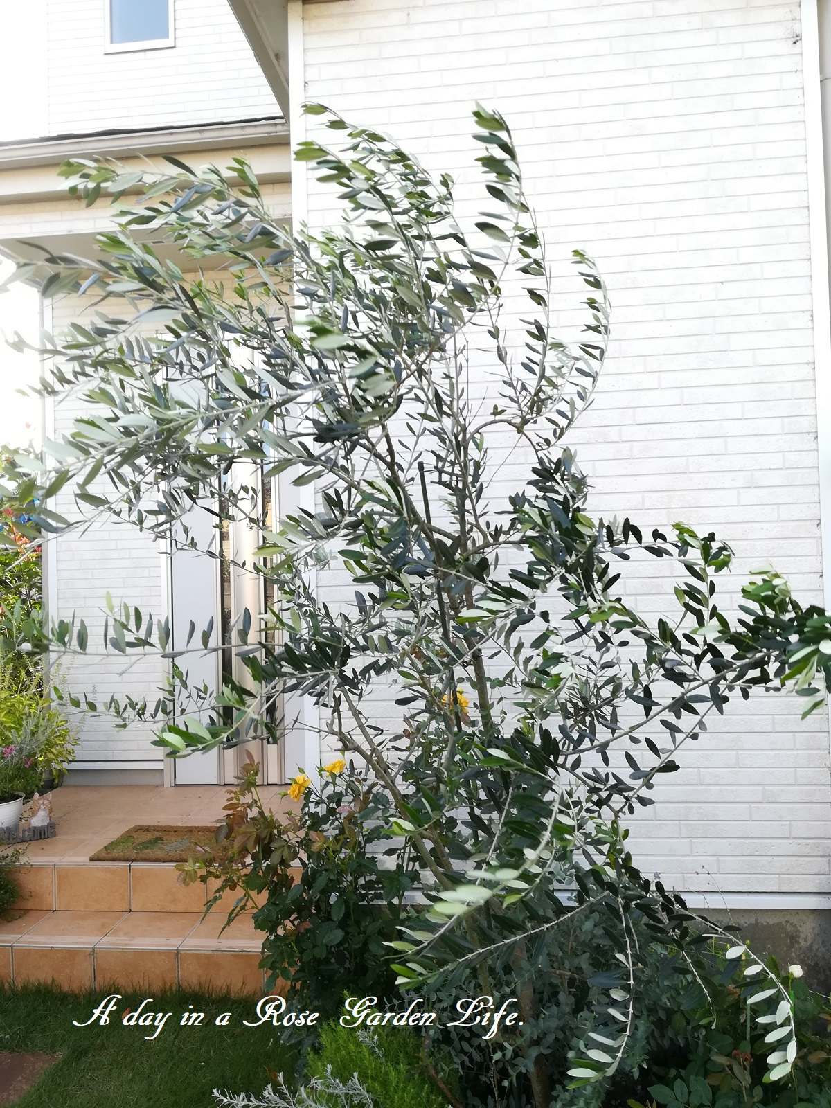 玄関のオリーブも、雨風でだいぶ傾いてしまうので、少し整枝しました。