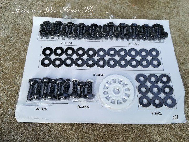 組み立て用のボルト。少し長い方がテーブル用で、数が多い方のボルトはチェアの足を取り付けるのに使います。