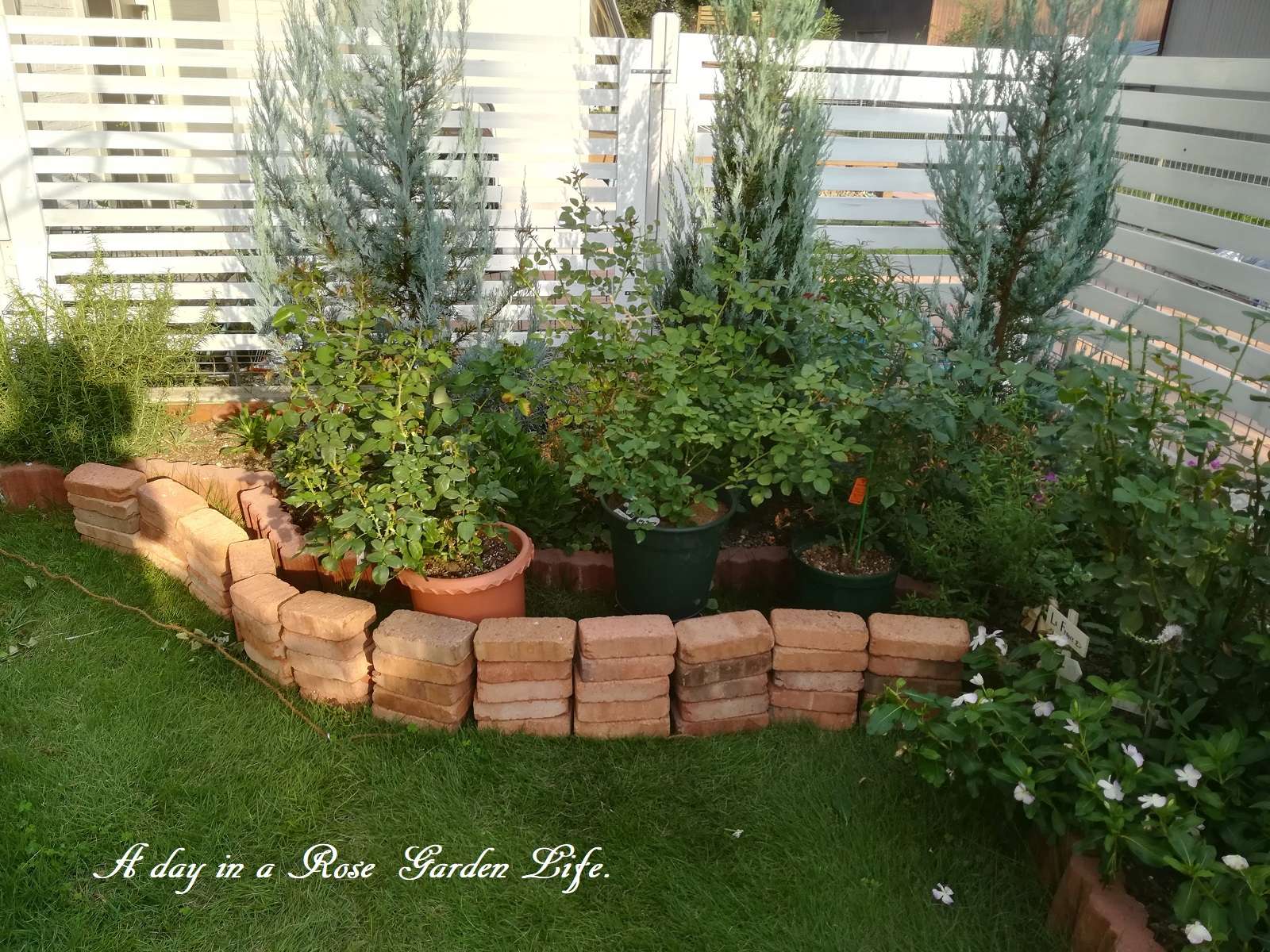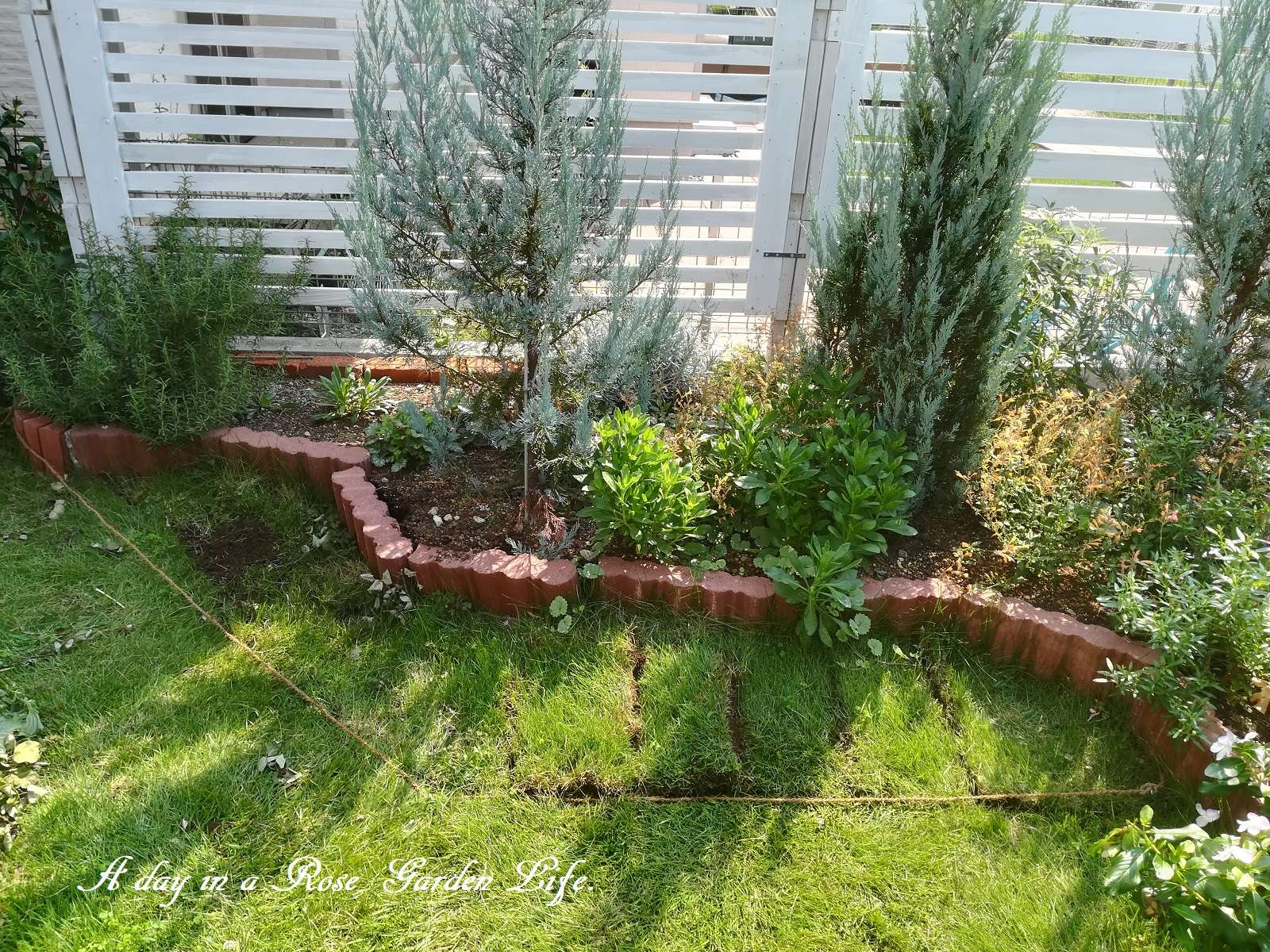 ここは我が家の庭でも南東側になるので、日当たりはこの写真での奥側フェンスよりなら良好ですが、コニファーを植えてあるのと、隣家の建物の配置の都合上、手前側は昼前にならないと直射日光が入ってこないスペースです。