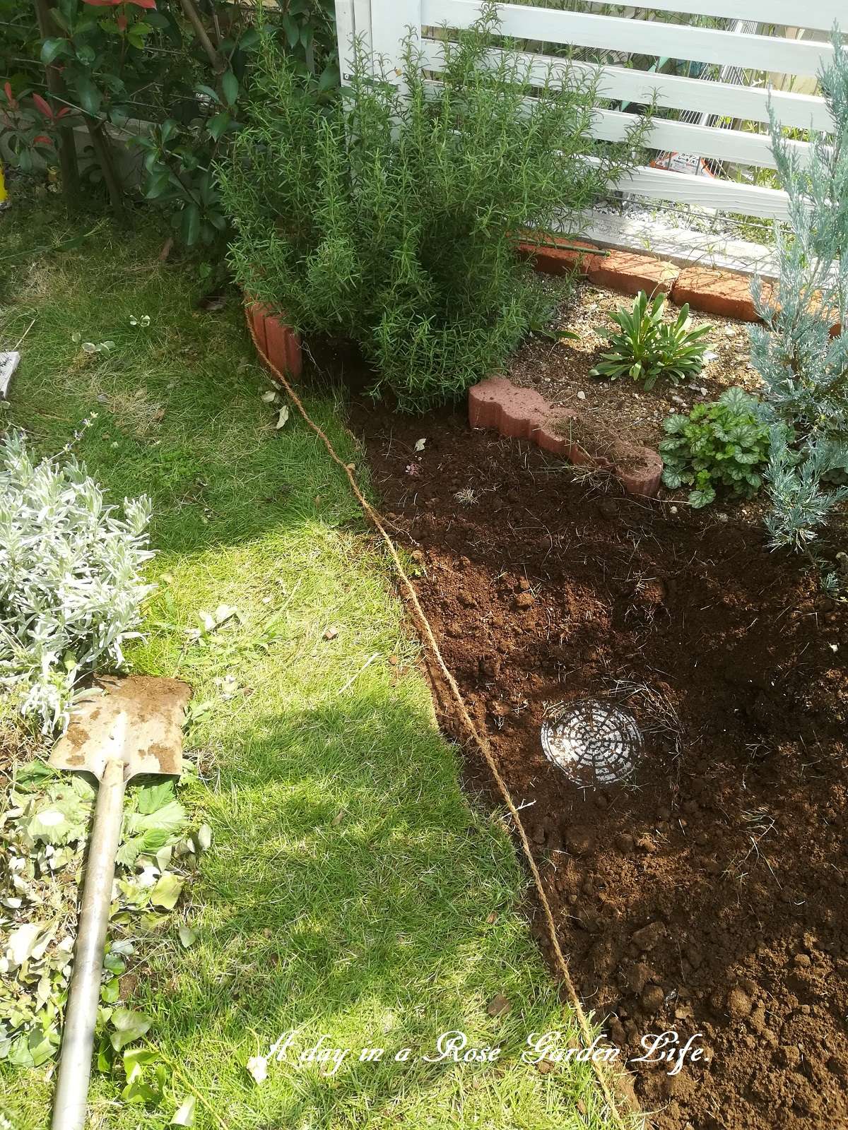 縄を貼って目印をつけ、芝生を剥がします。