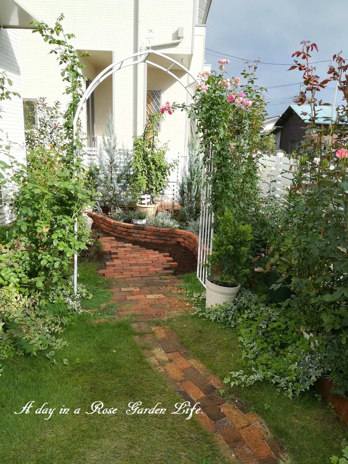 アーチ奥の、花壇までの間のスペースは、以前は芝生になっていましたが、管理を簡略化するためとデザインの統一感を持たせるために、レンガ敷きへ変えていきます。