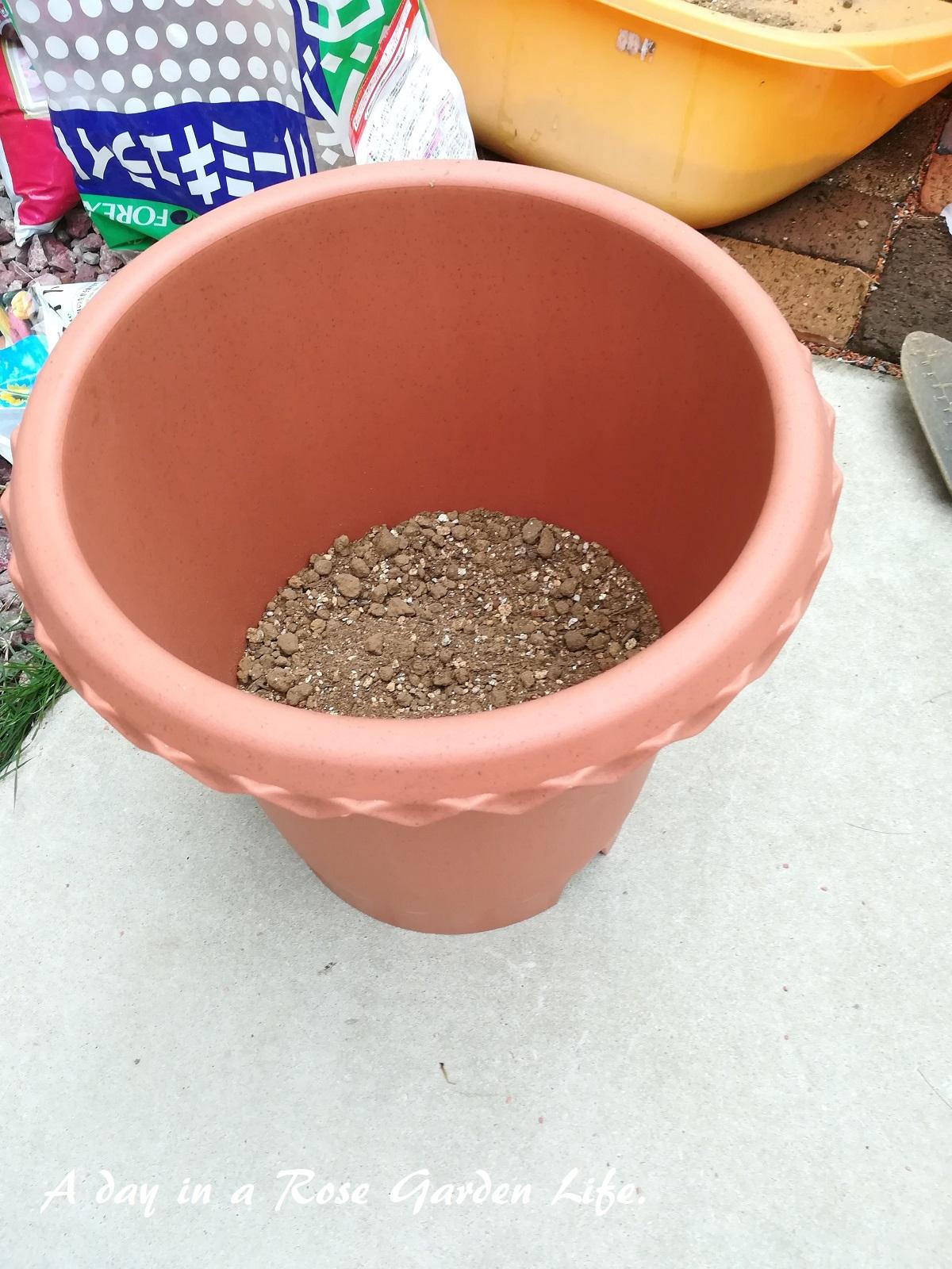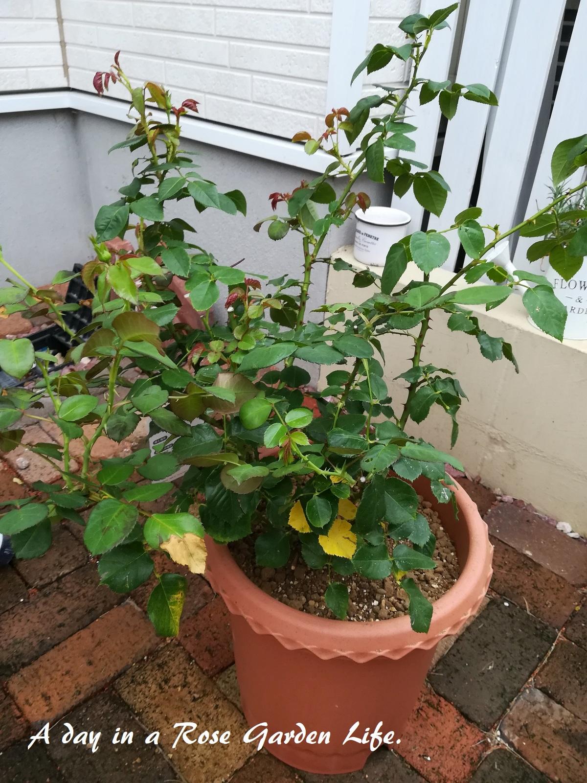 冬になったらアーチの近くへ地植えしようと思っていますが、夏の間は水切れさせないように大きめの10号鉢で管理します。