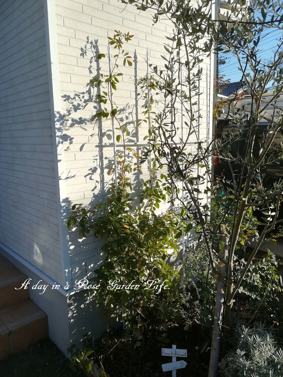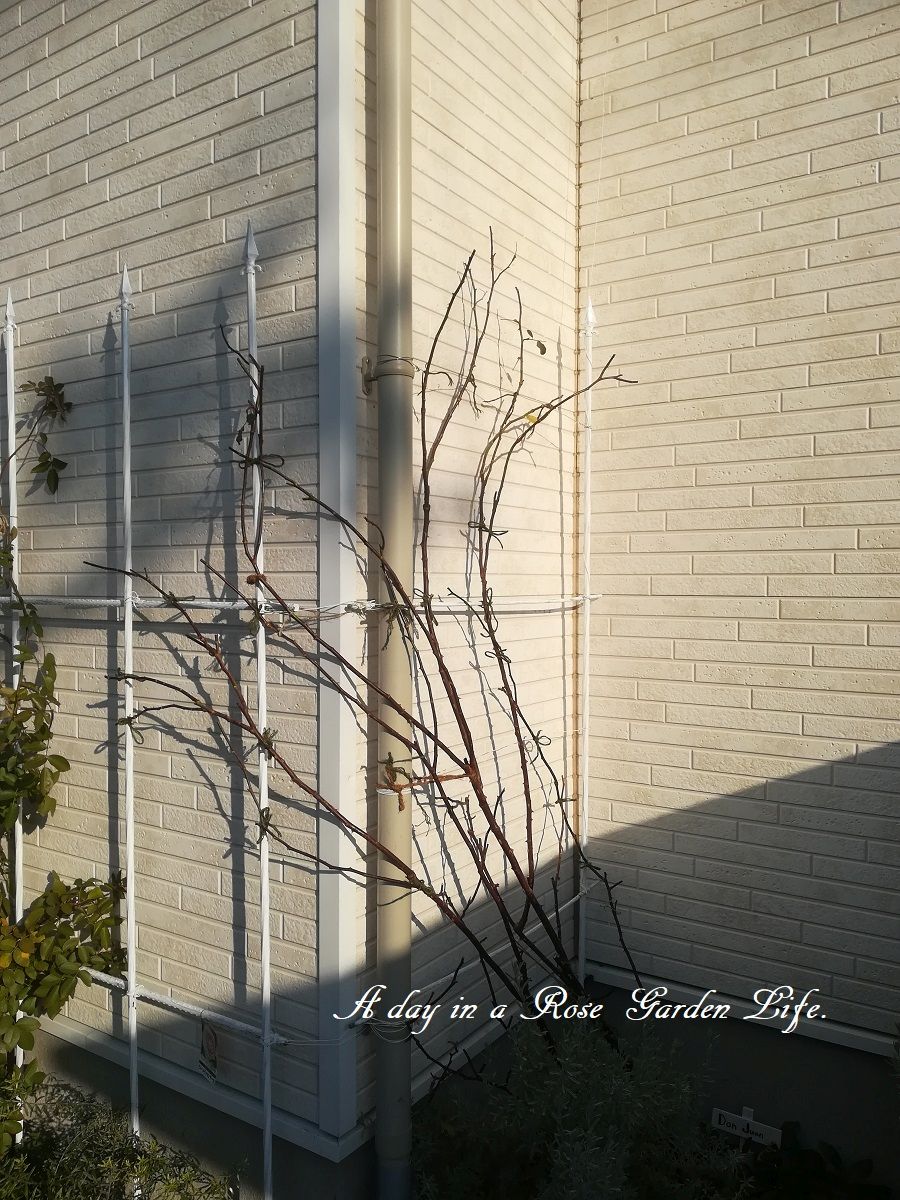 年末休みは実家帰省なのと、来週は土曜出勤があるので、急ピッチでつるバラの誘引を進めています。今日はエントランスの壁面誘引にしている