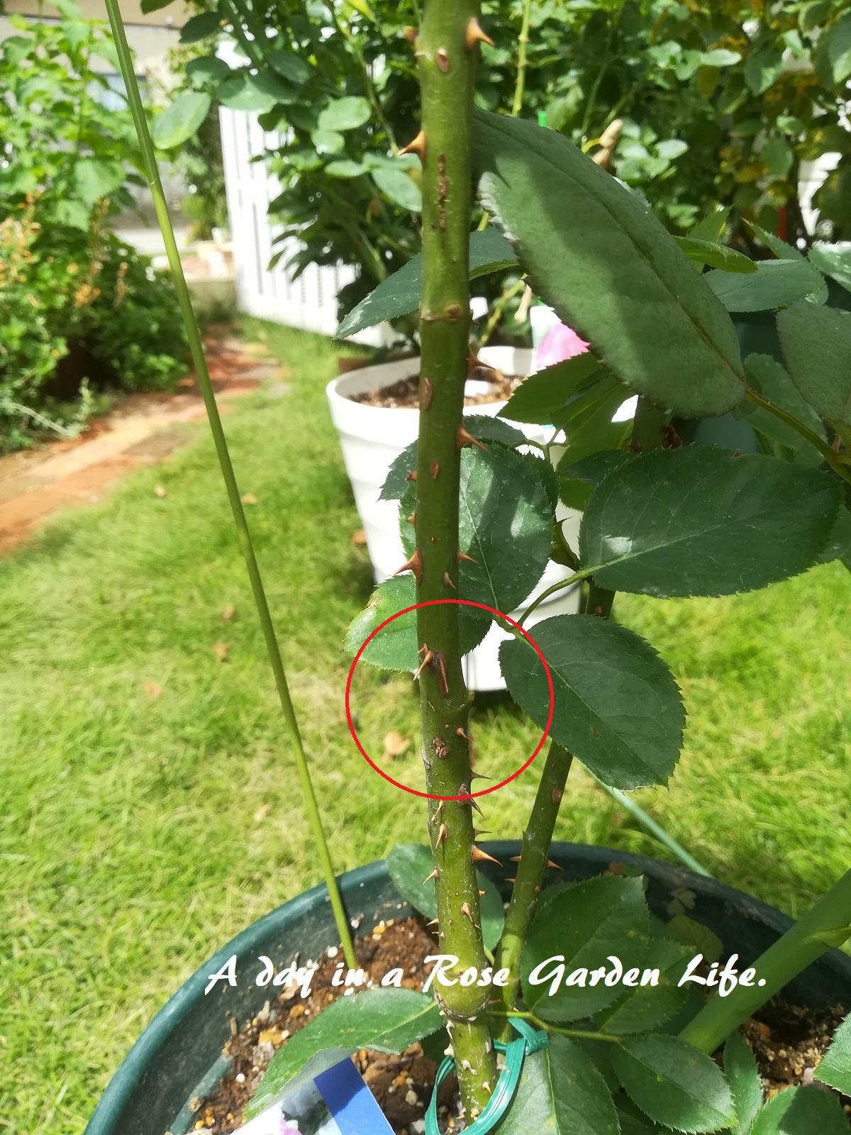 葉が落ちてしまっている枝にも、いくつか芽があるのですが、バラには頂芽優勢の性質があるので、上の方にある芽しか育ちません。
