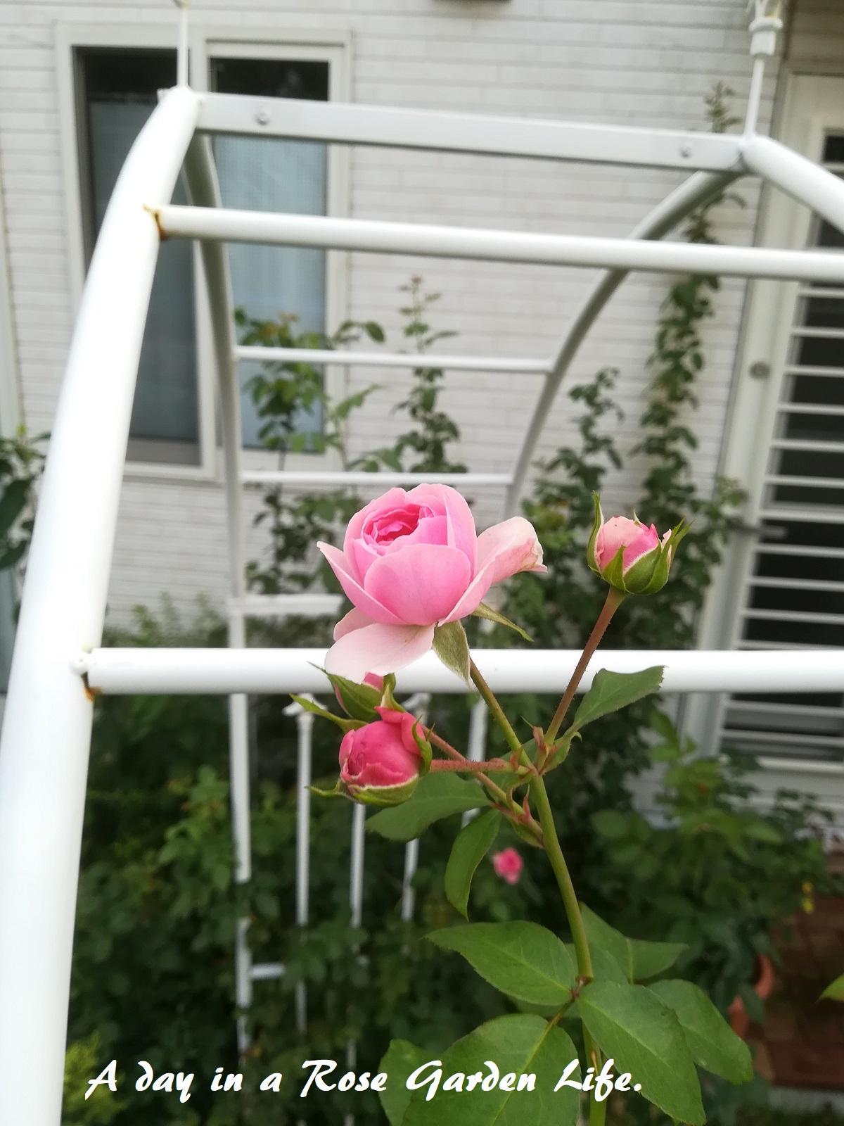 レオナルドダビンチは、昨年長尺苗で植えたのですが、成長はそれほど速くなく、そのペースがアーチにぴったりなバラです。ピエール・ドゥ・ロンサールなんかをこの華奢なアーチにからませたら、手に負えなくなるのは明白。