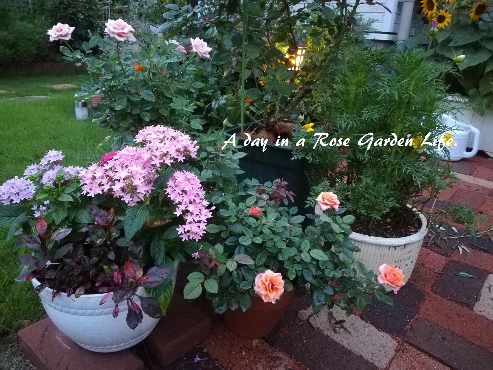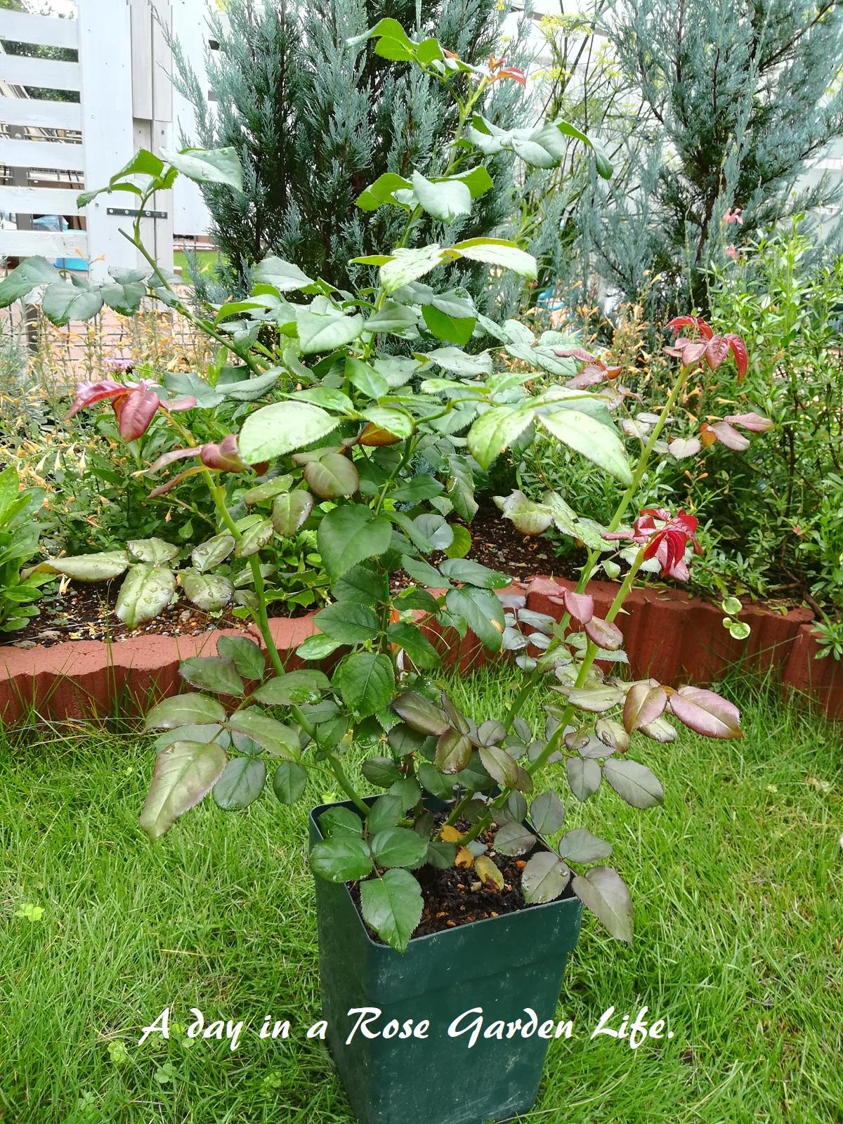 7/16に植えたハンス・ゲーネバインとフェリシテ・パルマンティエを、6号鉢から8号鉢へ鉢増ししました。