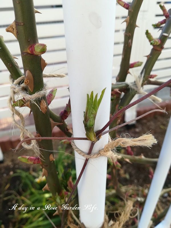 バラもさらに芽吹きが進んできました。まだ品種によってばらつきがあるんですが、この芳純やシェエラザードはかなり芽吹きが進んでいるので、芽かきを開始しました。今の段階では、明らかに無駄になる芽だけを摘んで、多めに残す形にしています。